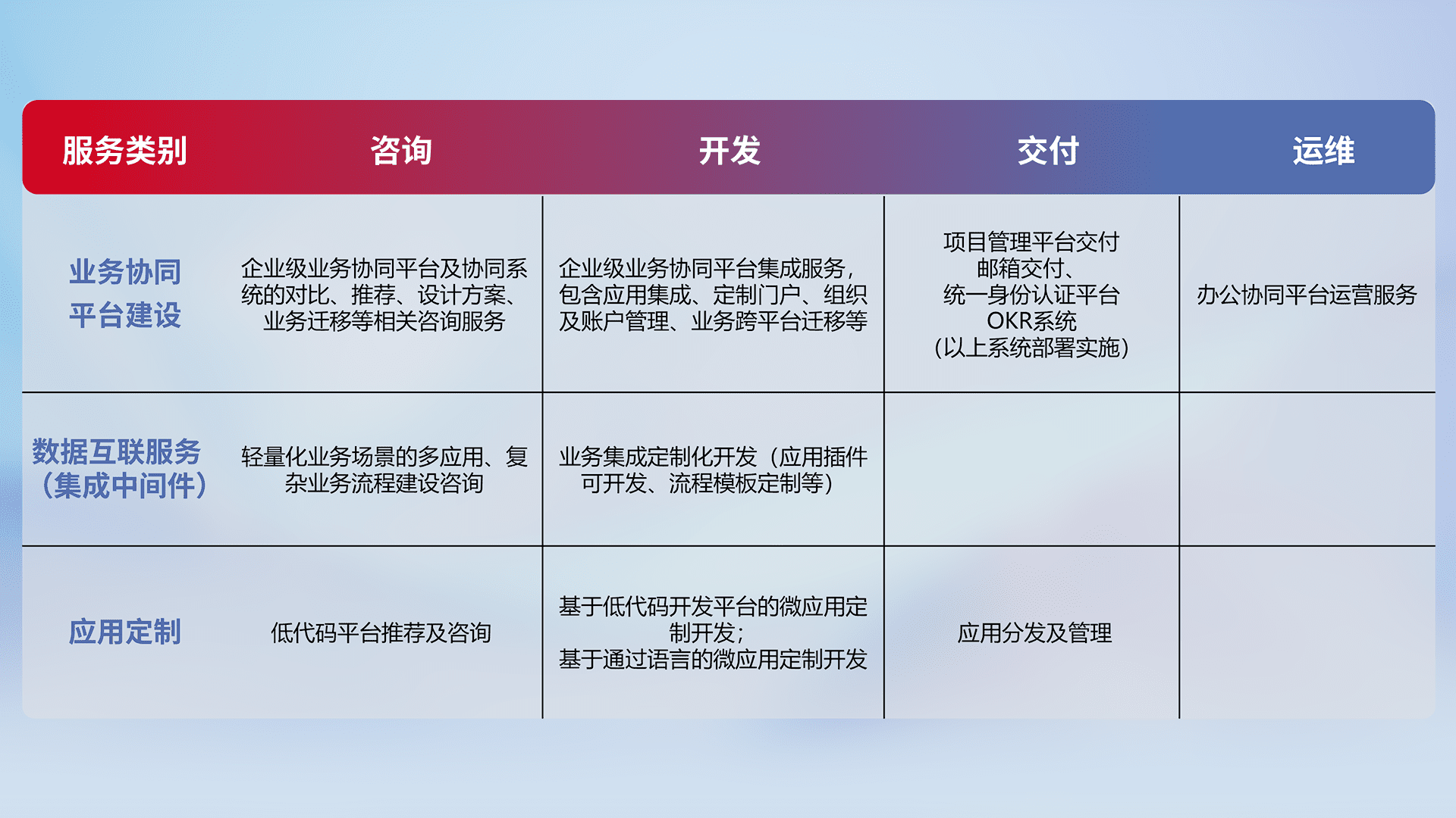 针对钉钉、、、企微、、、、IDaas等平台级产品提供产品的规划、、、、方案、、交付、、、、定制化开发等服务,,实现如统一协同办公、、智能客户服务、、、、混合会议管理、、智能数据查询、、、、等业务场景,,实现数字化转型。。。。