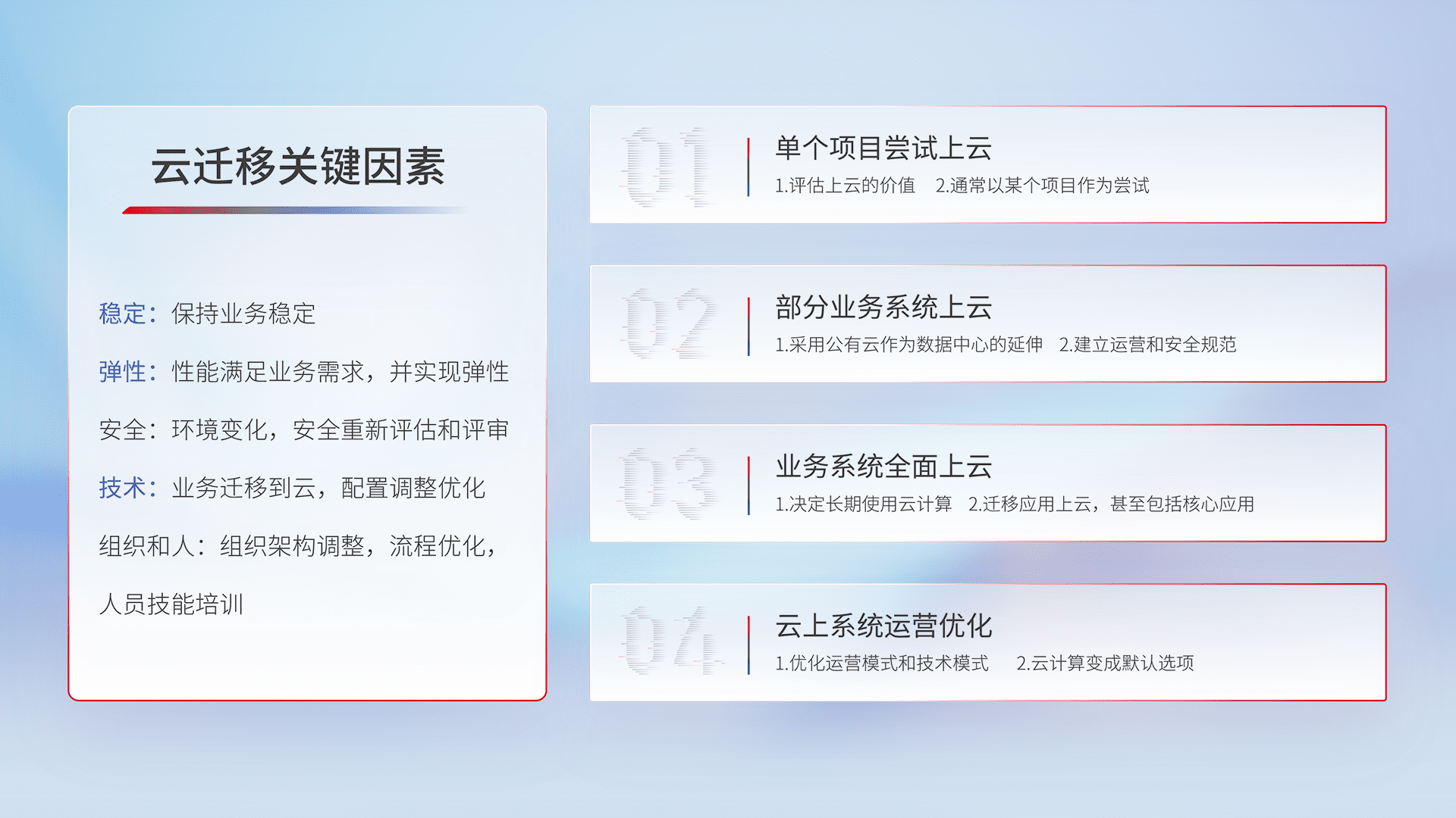 结合实际业务,,,从规划设计、、、云平台选型、、、云原生改造、、、数据迁移、、集成交付,,迁移全过程为客户识别最佳上云路径,,,做好风险识别管理,,,,设计网络架构、、、、身份权限、、、安全审计合规、、、操作审计、、、、日志审计、、、、监控告警策略、、多站点容灾设计等,,,,对云上基础设施进行整体规划,,,提升IT治理水平,,,以满足弹性、、、高可用、、、高性能的需求。。。