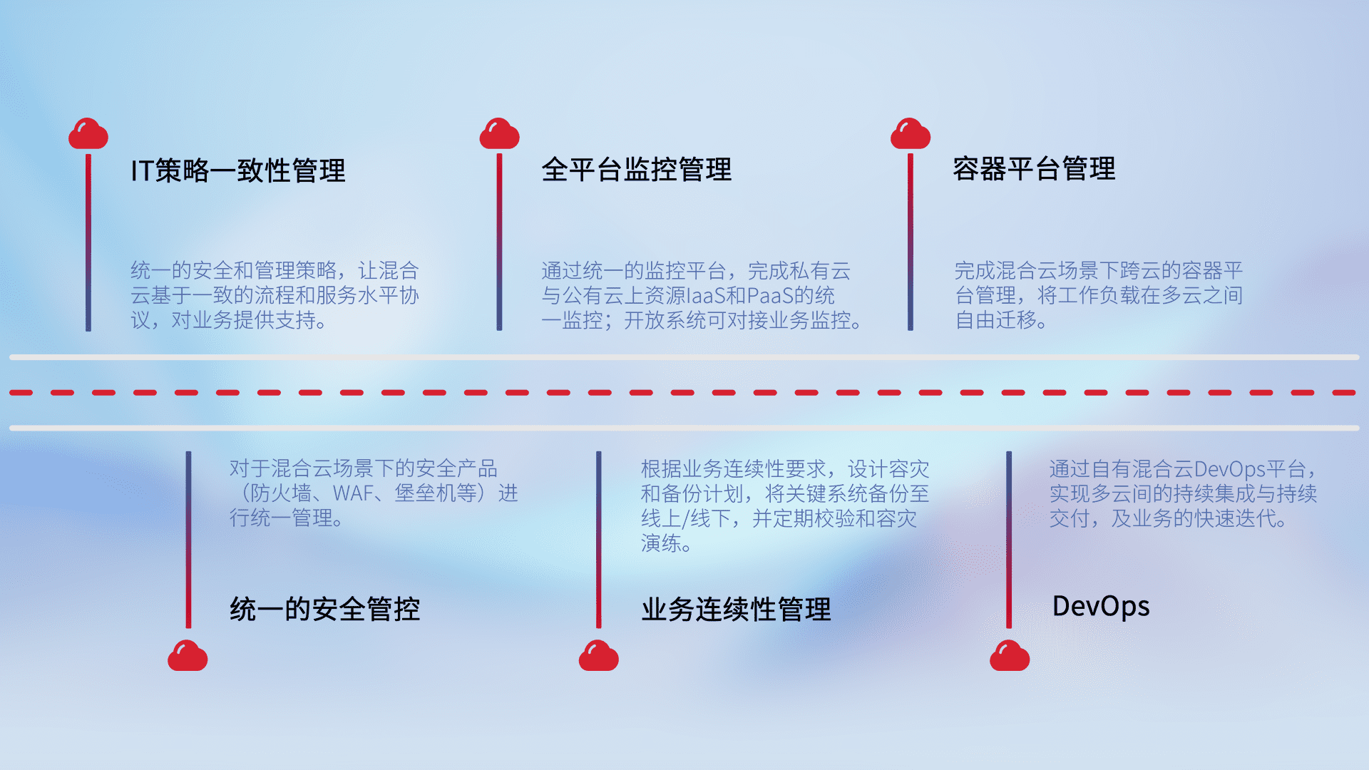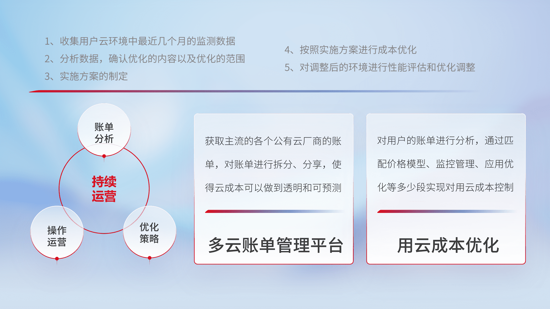 通过多云纳管,,,,以统一的资源数据模型把客户的云资源进行抽象和封装,,,,进而实现对多云资源的统一操作,,,,保障云资源管理的可靠性、、、、稳定性与可用性。。。量身定制化运维内容,,配置、、、、开发运维、、、补丁管理、、备份、、监控、、、认证和访问管理、、审计和日常巡检等,,,保障在用云过程中的可靠度,,,,稳定度以及高可用率。。。